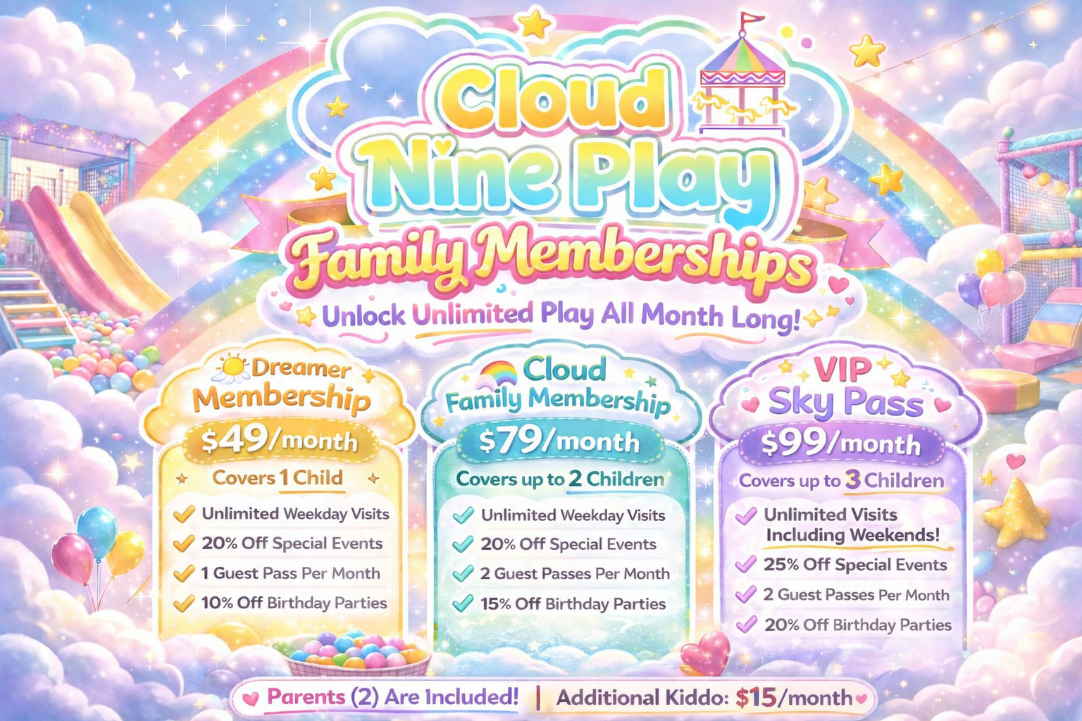 At Cloud Nine, we believe every child deserves a safe, exciting, and memorable play experience — without breaking the bank. Our pricing has been designed to keep family fun affordable, flexible, and packed with value. Whether you’re coming in for an open play session or planning a big birthday bash, we’ve got something for everyone.